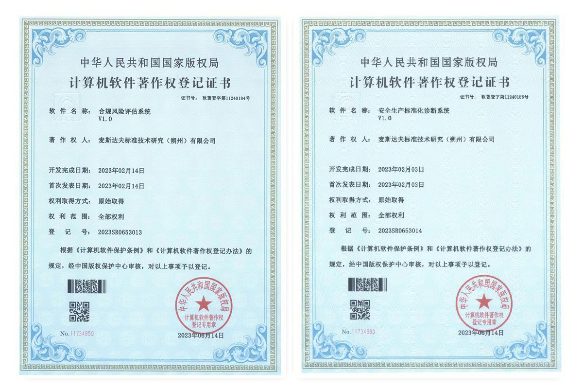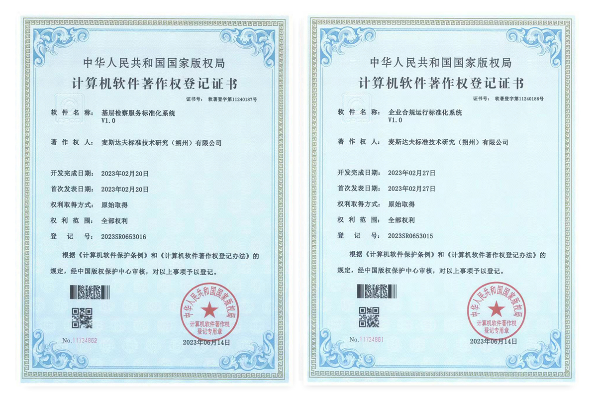 2023年6月16日,麥斯達(dá)夫標(biāo)準(zhǔn)技術(shù)研究 (朔州)有限公司獲得四項(xiàng)軟件著作權(quán)證書,“基層檢察服務(wù)標(biāo)準(zhǔn)化系統(tǒng)V1.0”“企業(yè)合規(guī)運(yùn)行標(biāo)準(zhǔn)化系統(tǒng)V1.0”“合規(guī)風(fēng)險(xiǎn)評估系統(tǒng)V1.0”“安全生產(chǎn)標(biāo)準(zhǔn)化診斷系統(tǒng)V1.0”。