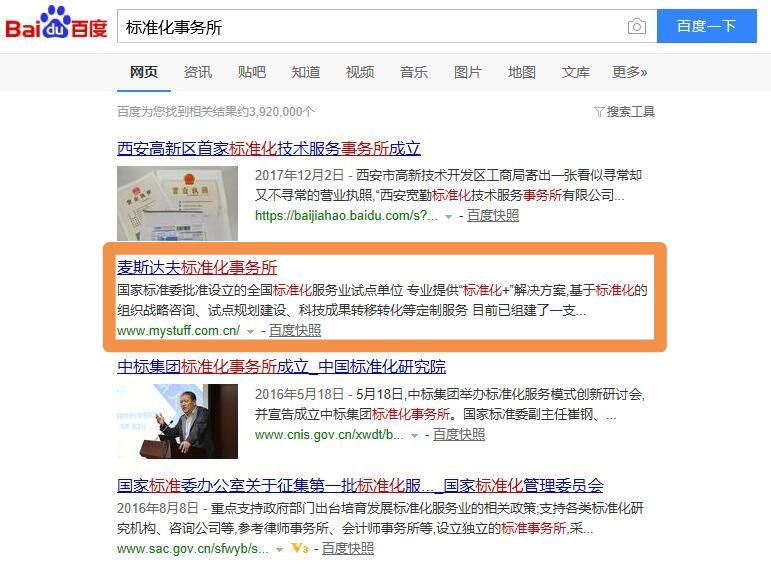 網(wǎng)頁端百度搜索關(guān)鍵詞“標(biāo)準(zhǔn)化事務(wù)所”,麥斯達(dá)夫位于首頁排名第二位: