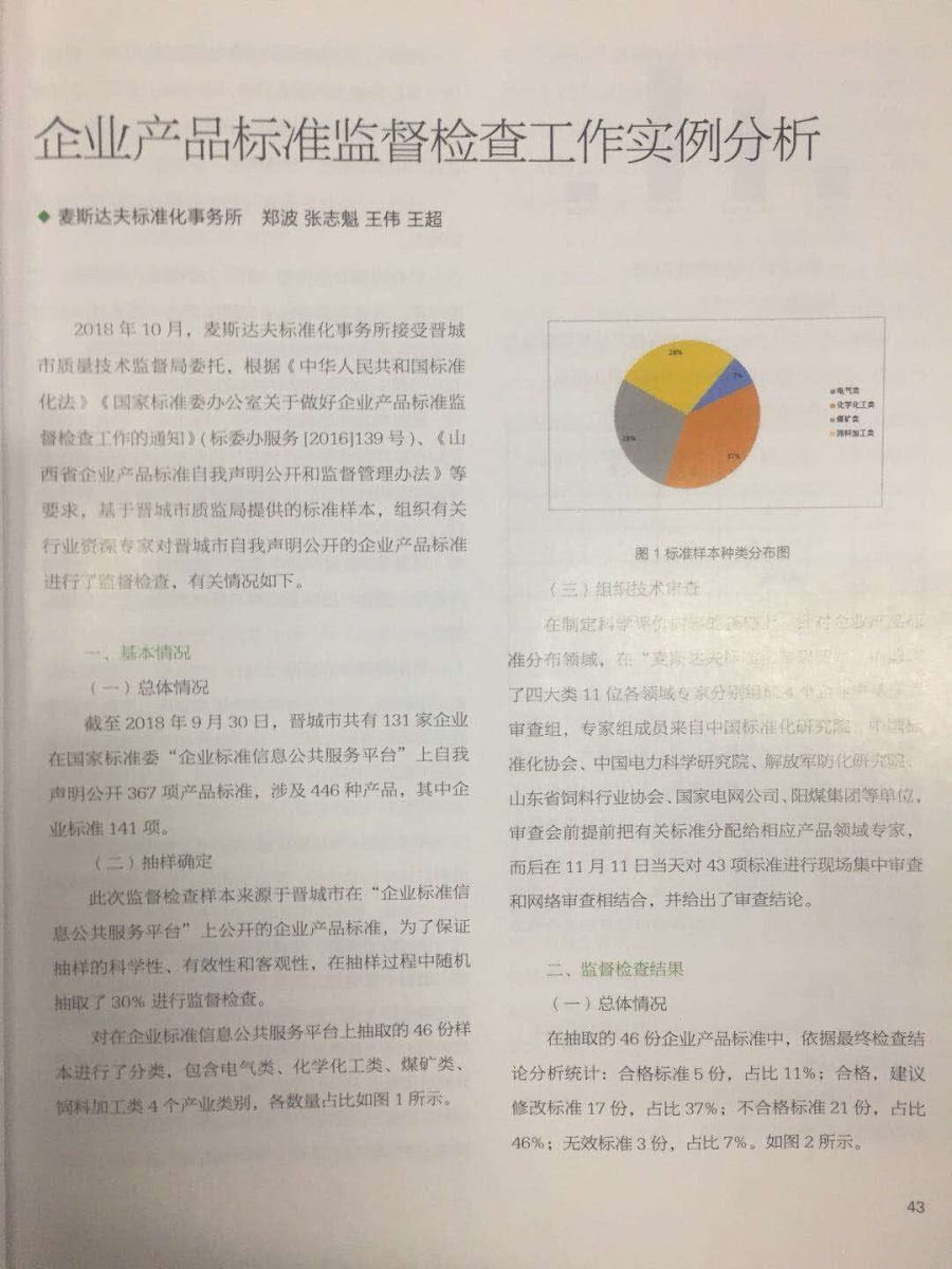 近日,由麥斯達夫標準化事務所鄭波、張志魁、王偉、王超四人完成的論文《企業(yè)產品標準監(jiān)督檢查工作實例分析》在《大眾標準化》(2018年第11期,總第292期)公開發(fā)表。