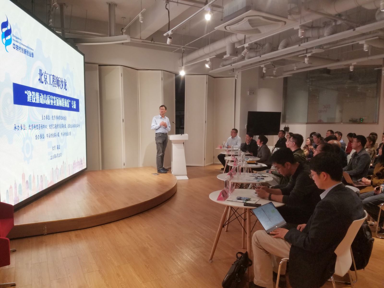 2019年4月29日,北京工程師沙龍第二期——“建設推動高質量發(fā)展標準體系”專場在海淀區(qū)中關村創(chuàng)客小鎮(zhèn)舉行。本次沙龍由北京市科協(xié)主辦,北京科技咨詢中心、北京工程師學會籌備組、麥斯達夫標準化事務所承辦,中關村創(chuàng)客小鎮(zhèn)、中關村創(chuàng)業(yè)大街協(xié)辦。本場沙龍是2019中關村創(chuàng)新創(chuàng)業(yè)季精彩系列活動之一。北京科技咨詢中心副主任張海新、科技咨詢部副部長袁潔,中關村創(chuàng)客小鎮(zhèn)技術總監(jiān)程清鴿、產(chǎn)品設計總監(jiān)李杰出席會議。沙龍由麥斯達夫標準化事務所首席執(zhí)行官鄭波主持。