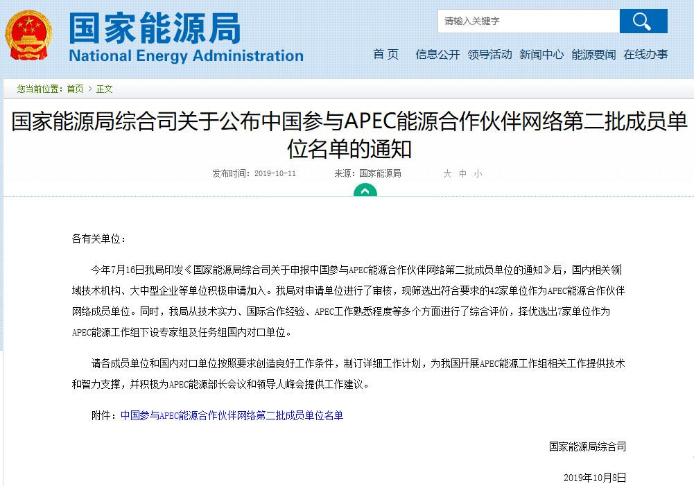 2019年7月16日,國家能源局印發(fā)《國家能源局綜合司關于申報中國參與APEC能源合作伙伴網(wǎng)絡第二批成員單位的通知》后,國內相關領域技術機構、大中型企業(yè)等單位積極申請加入。國家能源局對申請單位進行了審核,現(xiàn)篩選出符合要求的42家單位作為APEC能源合作伙伴網(wǎng)絡成員單位。同時,國家能源局從技術實力、國際合作經驗、APEC工作熟悉程度等多個方面進行了綜合評價,擇優(yōu)選出7家單位作為APEC能源工作組下設專家組及任務組國內對口單位。
