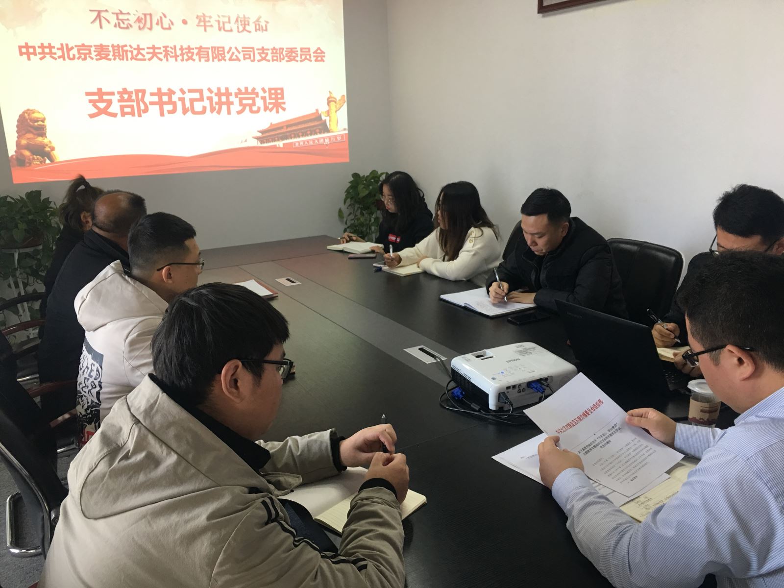 為進(jìn)一步深化“不忘初心、牢記使命”主題教育,集中傳達(dá)學(xué)習(xí)黨的十九屆四中全會(huì)精神,2019年12月2日,中共北京麥斯達(dá)夫科技有限公司支部委員會(huì)組織開展“支部書記講黨課”活動(dòng)。