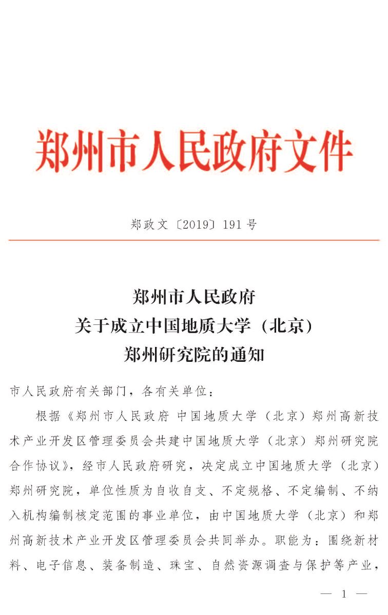 鄭州市人民政府關于成立中國地質大學 (北京)鄭州研究院的通知