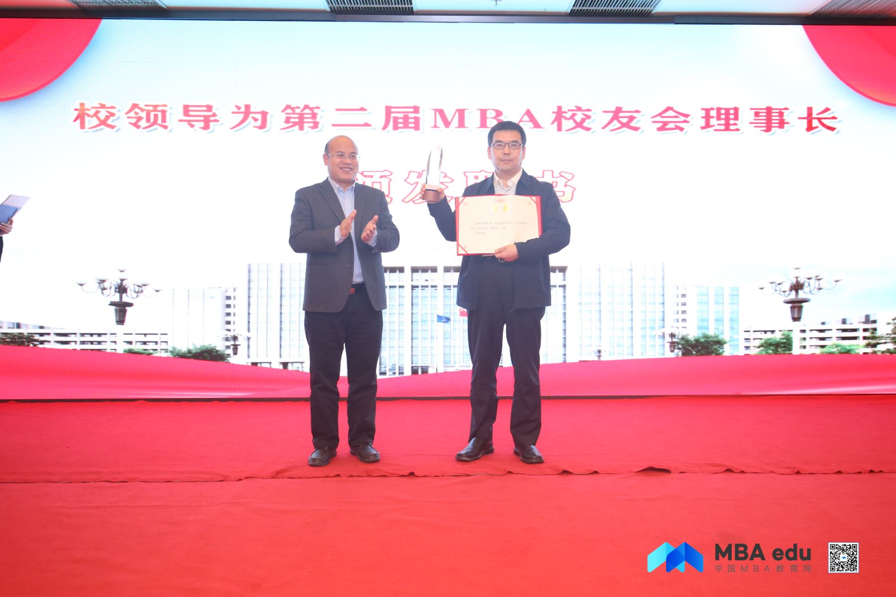 根據(jù)預(yù)備會(huì)議選舉投票,會(huì)議推舉經(jīng)濟(jì)與管理學(xué)院院長(zhǎng)、MBA教育中心主任李彥斌擔(dān)任第二屆MBA校友會(huì)理事長(zhǎng)。黃向軍為新任理事長(zhǎng)頒發(fā)聘書(shū)。