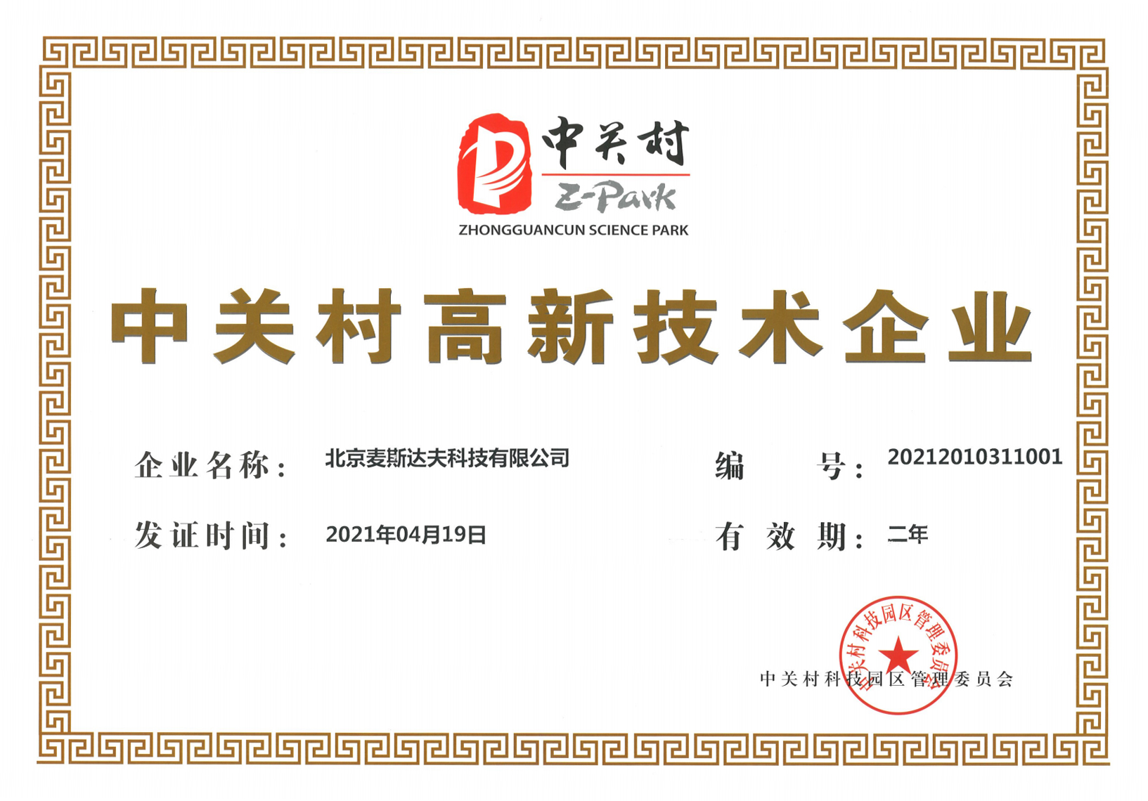2021年4月19日,北京麥斯達夫科技有限公司通過“中關(guān)村高新技術(shù)企業(yè)”復(fù)核,再次獲得資質(zhì)認定。
