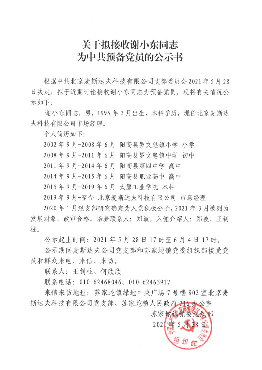根據(jù)中共北京麥斯達(dá)夫科技有限公司支部委員會(huì)2021年5月28日決定,擬于近期討論接收謝小東同志為預(yù)備黨員,現(xiàn)將有關(guān)情況公示如下: