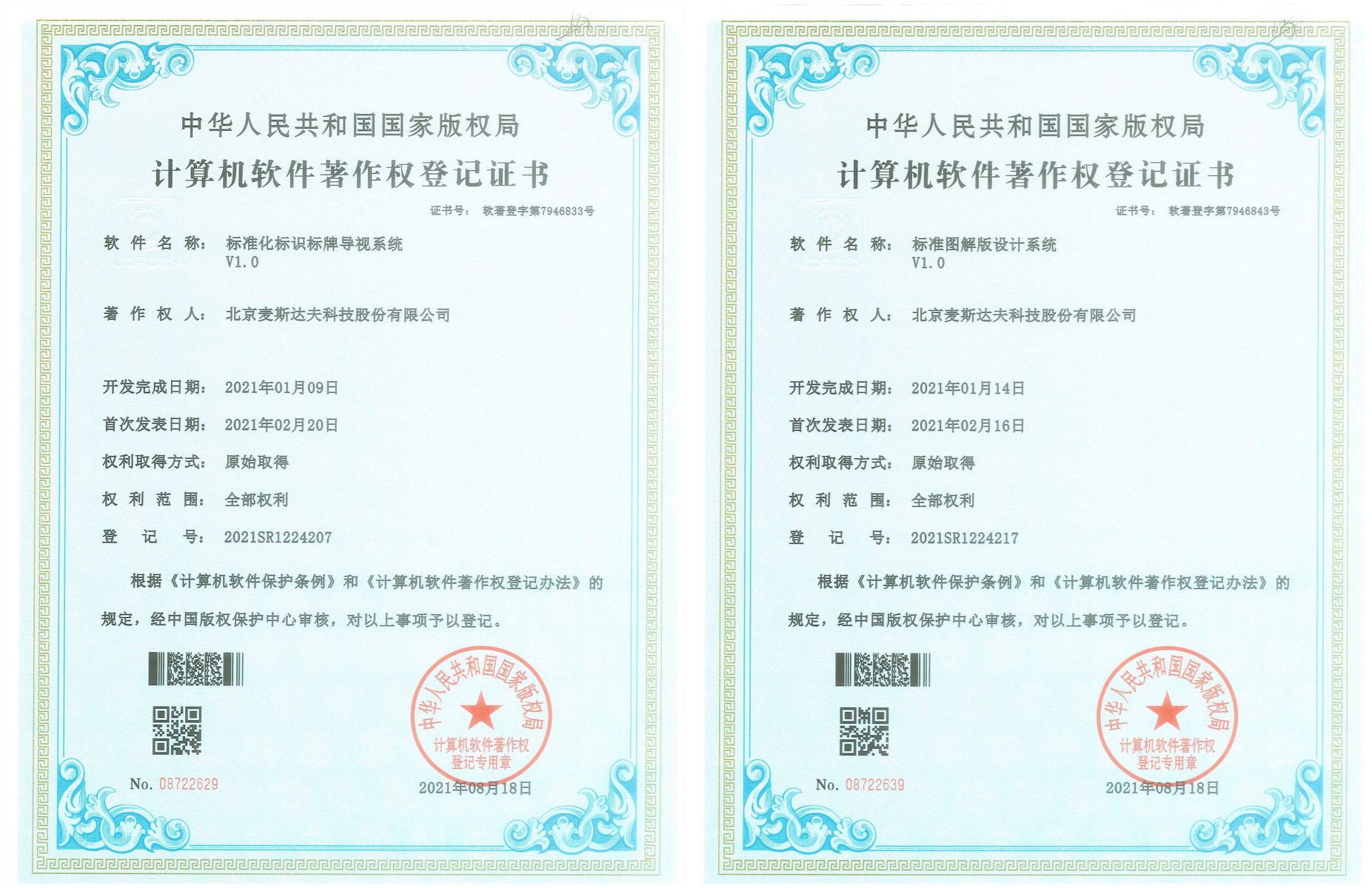 2021年8月18日,北京麥斯達夫科技股份有限公司獲得兩項軟件著作權(quán)證書,“標(biāo)準(zhǔn)化標(biāo)識標(biāo)牌導(dǎo)視系統(tǒng)”和“標(biāo)準(zhǔn)圖解版設(shè)計系統(tǒng)”。