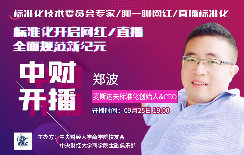 2021年9月25日,麥斯達(dá)夫標(biāo)準(zhǔn)化創(chuàng)始人、首席執(zhí)行官鄭波應(yīng)邀為中央財經(jīng)大學(xué)作題為“標(biāo)準(zhǔn)化開啟網(wǎng)紅/直播全面規(guī)范新紀(jì)元”的直播講座。本次活動由中央財經(jīng)大學(xué)商學(xué)院校友會、中央財經(jīng)大學(xué)商學(xué)院金融俱樂部主辦。來自中央財經(jīng)大學(xué)的三十余位校友參加線上直播活動。