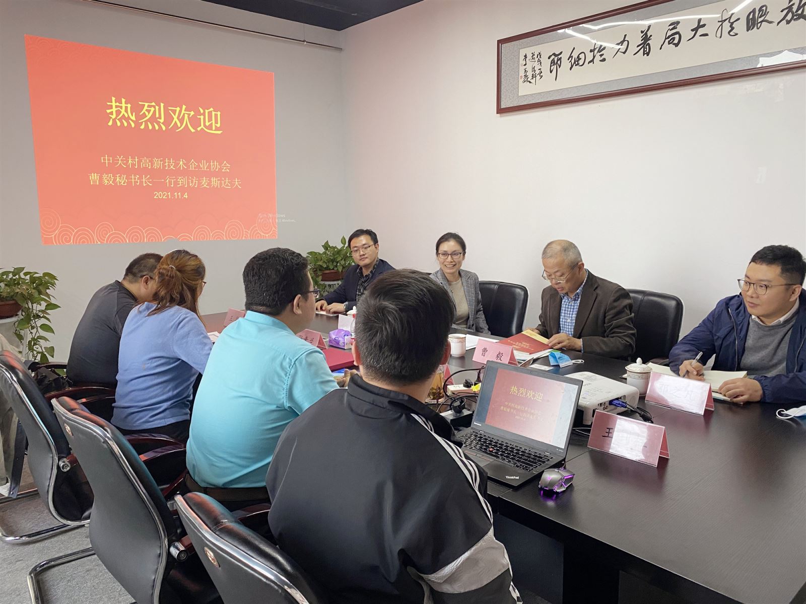 2021年11月4日,中關(guān)村高新技術(shù)企業(yè)協(xié)會常務(wù)副會長、秘書長曹毅,秘書長助理郭佳、鄧之凡,科技服務(wù)專委會工作組李萬鵬一行蒞臨交流。麥斯達夫首席執(zhí)行官鄭波、市場總監(jiān)王釗柱、財務(wù)經(jīng)理張素蘭參加會見。