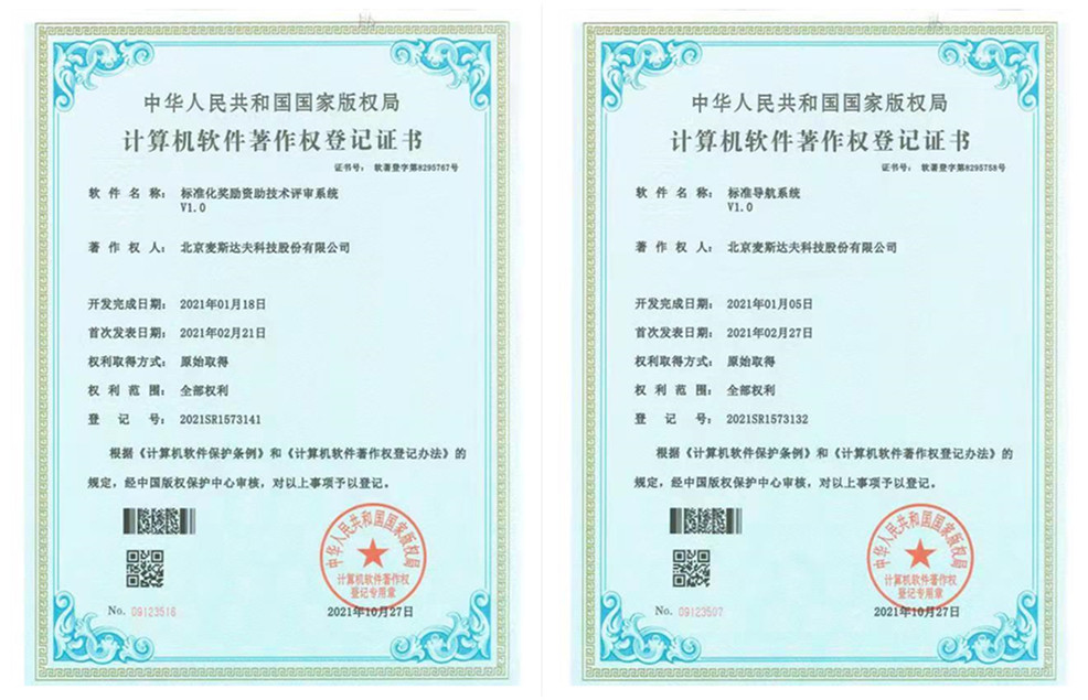 2021年10月27日,北京麥斯達夫科技股份有限公司獲得兩項軟件著作權(quán)證書,“標準化獎勵資助技術(shù)評審系統(tǒng)”和“標準導(dǎo)航系統(tǒng)”。