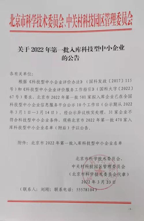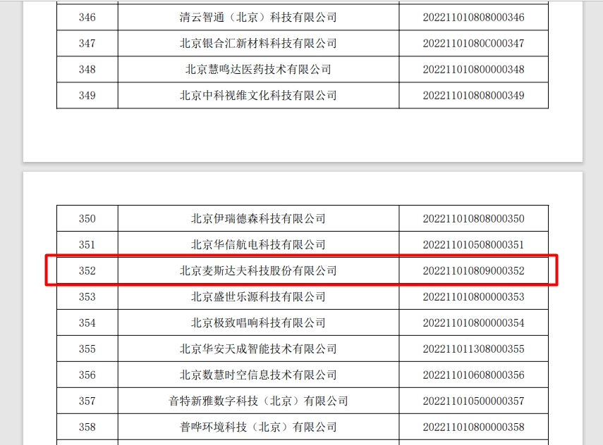 2022年3月23日,北京市科學技術委員會、中關村科技園區(qū)管理委員會發(fā)布《關于2022年第1批入庫科技型中小企業(yè)名單的公告》,共470家企業(yè)入圍,其中北京麥斯達夫科技股份有限公司成功位列其中。