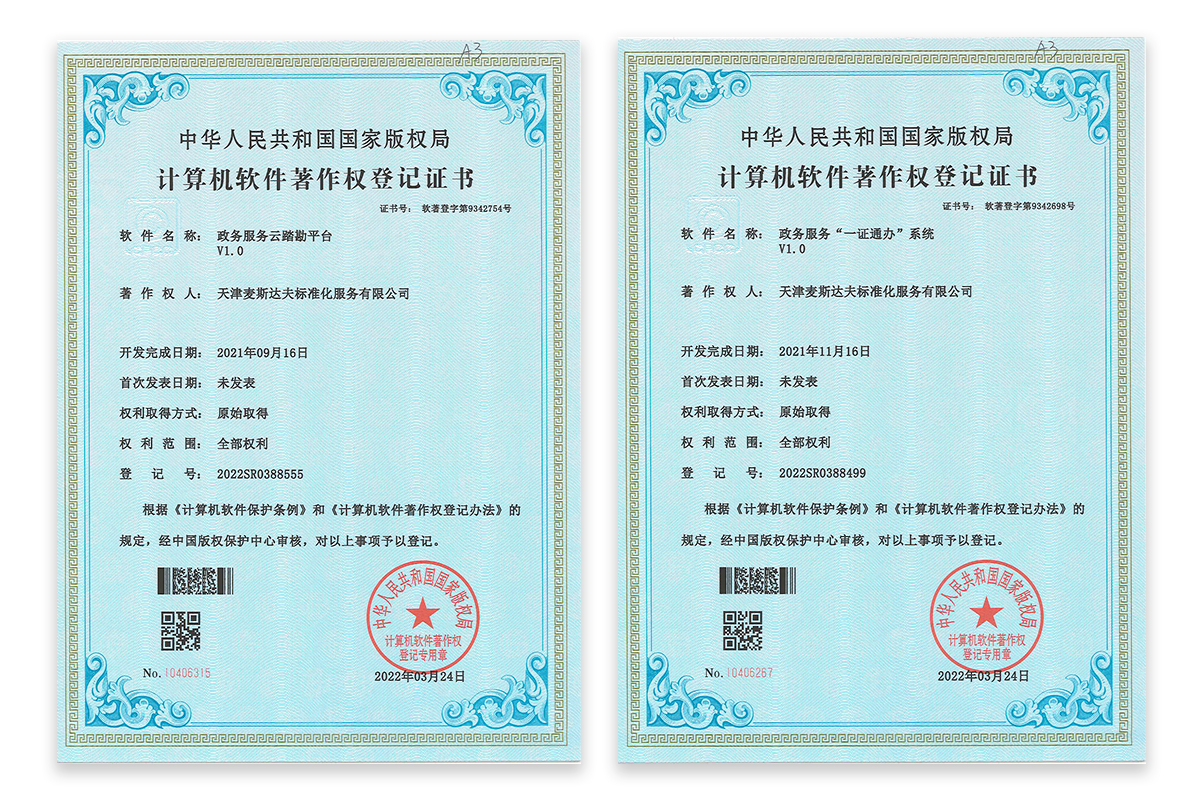 2022年5月16日,天津麥斯達(dá)夫標(biāo)準(zhǔn)化服務(wù)有限公司獲得兩項(xiàng)軟件著作權(quán)證書,“政務(wù)服務(wù)云踏勘平臺V1.0”“政務(wù)服務(wù)‘一證通辦’系統(tǒng)V1.0”。