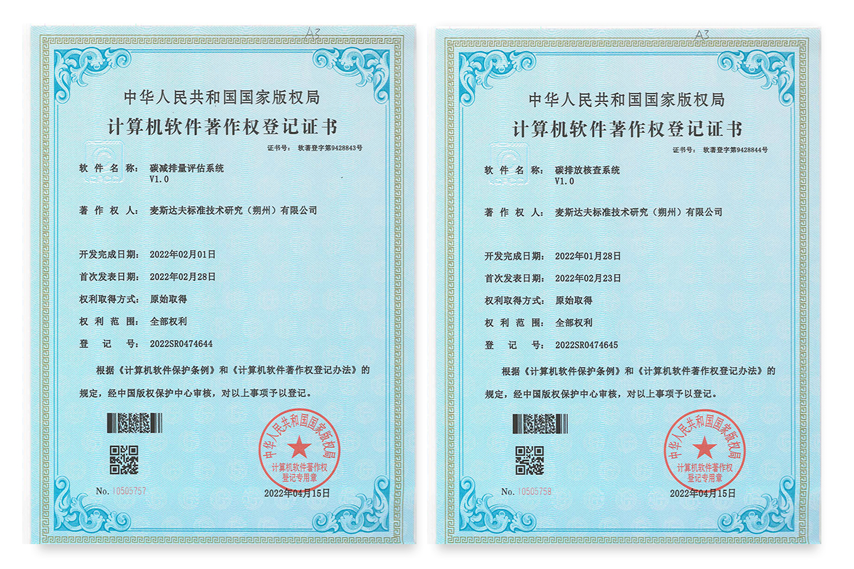 2022年5月16日,麥斯達夫標準技術研究 (朔州)有限公司獲得兩項軟件著作權證書,“碳減排量評估系統(tǒng)V1.0”“碳排放核查系統(tǒng)V1.0”。