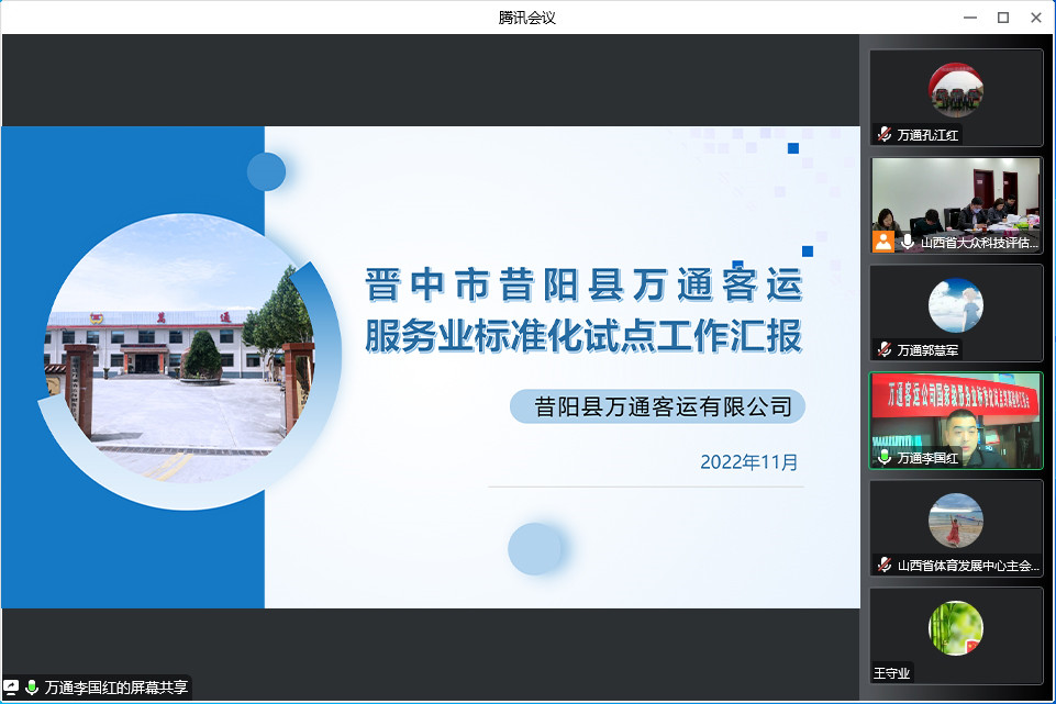 2022年11月18日,晉中市昔陽縣萬通客運服務業(yè)標準化試點終期驗收評估會以網絡會議形式召開。山西省市場監(jiān)督管理局標準管理處處長王守業(yè)、二級調研員秦忠武帶隊,來自山西省社會科學院、山西省檢驗檢測中心、中國(山西)知識產權保護中心、中國標準化研究院、山西省標準計量技術研究院的五位專家組成評估專家組。晉中市市場監(jiān)督管理局標準化協(xié)調推進管理科科長尹志鵬,昔陽縣市場監(jiān)督管理局副局長田志兵、縣客運辦主任孔德峰,萬通客運有限公司經理尹鵬軍出席會議。