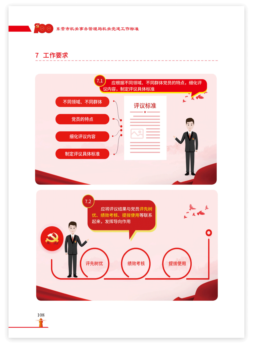《東營(yíng)市機(jī)關(guān)事務(wù)管理局機(jī)關(guān)黨建工作標(biāo)準(zhǔn)》(圖解版)系統(tǒng)梳理了機(jī)關(guān)黨建工作的規(guī)章制度,把機(jī)關(guān)黨建工作的內(nèi)容、要求、流程都以標(biāo)準(zhǔn)的形式固定下來(lái)。全書涵蓋了黨組理論學(xué)習(xí)中心組學(xué)習(xí)、黨組織書記抓基層黨建述職評(píng)議考核、機(jī)關(guān)黨建換屆選舉、黨員發(fā)展、“三會(huì)一課”、主題黨日活動(dòng)、組織生活會(huì)、民主評(píng)議黨員、“身邊的榜樣”選樹(shù)等九個(gè)方面的工作,既包含了機(jī)關(guān)黨建的規(guī)定動(dòng)作,也在黨建工作與業(yè)務(wù)工作融合上進(jìn)行了初步探索,供黨建工作者學(xué)習(xí)參考。全書以“標(biāo)準(zhǔn)圖解版”的形式呈現(xiàn),一共繪制了242張圖片,每一個(gè)場(chǎng)景、每一個(gè)細(xì)小元素均經(jīng)過(guò)精心設(shè)計(jì)。
