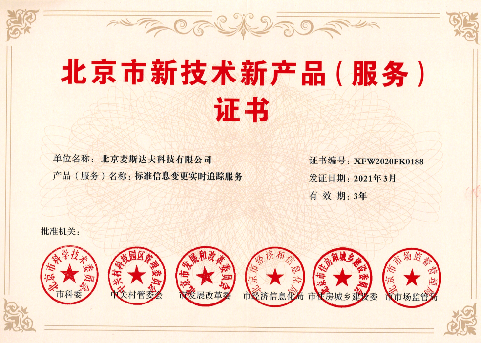 麥斯達(dá)夫標(biāo)準(zhǔn)化事務(wù)所自主研發(fā)的"標(biāo)準(zhǔn)信息變更實(shí)時(shí)追蹤服務(wù)"成功入選第十四批北京市新技術(shù)新產(chǎn)品(服務(wù))。