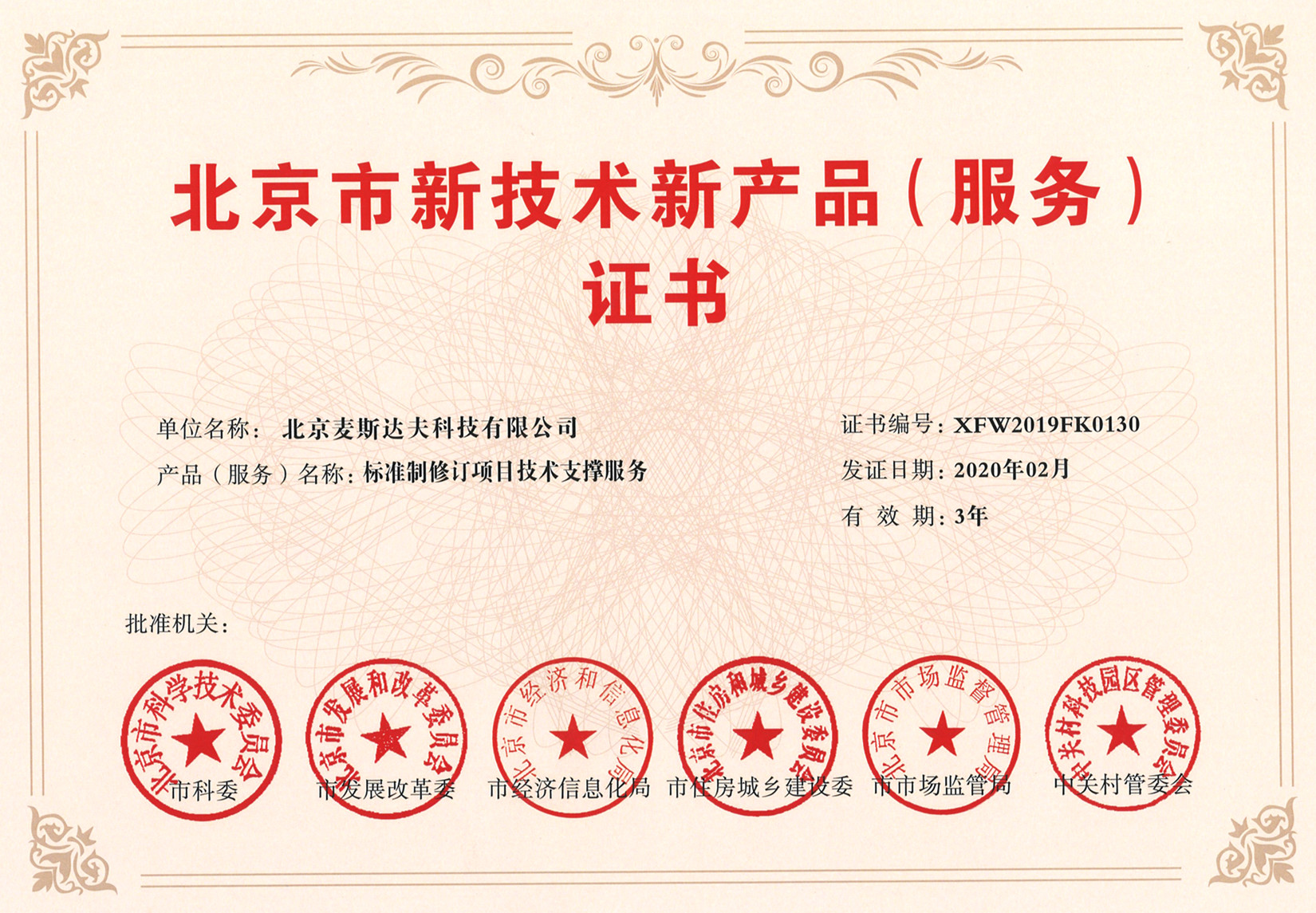 麥斯達(dá)夫標(biāo)準(zhǔn)化事務(wù)所申報(bào)的“標(biāo)準(zhǔn)制修訂項(xiàng)目技術(shù)支撐服務(wù)”成功入選第十一批北京市新技術(shù)新產(chǎn)品(服務(wù))。