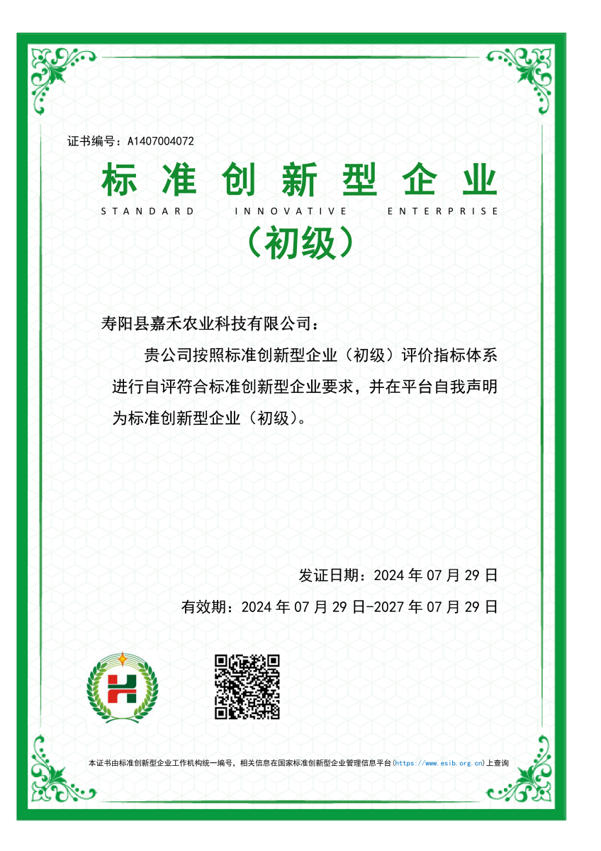 壽陽縣嘉禾農(nóng)業(yè)科技有限公司獲評標(biāo)準(zhǔn)創(chuàng)新型企業(yè)